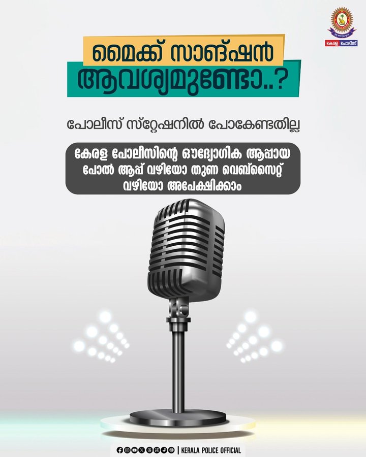 ഉച്ചഭാഷിണി ഉപയോഗിക്കുന്നതിന് അനുമതിക്കുള്ള അപേക്ഷ നൽകാൻ പോലീസ് സ്റ്റേഷനുകളിൽ പോകേണ്ടതില്ല. കേരള പോലീസിന്റെ ഔദ്യോഗിക ആപ്പായ ‘പോൽ ആപ്പ് ‘ വഴിയോ ‘തുണ’ വെബ്സൈറ്റ് വഴിയോ നിങ്ങൾക്ക് അപേക്ഷ സമർപ്പിക്കാവുന്നതാണ്.