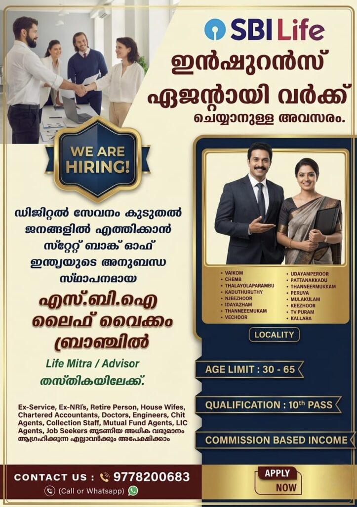 പൊതുമേഖലാ ബാങ്കിന്റെ അനുബന്ധ സ്ഥാപനമായ SBI Life വൈക്കം Branch ൽ കമ്മീഷൻ /സാലറി അടിസ്ഥാനത്തിൽ ഫീൽഡ് അഡ്വൈസേഴ്സ് ഉദ്യോഗാർഥികളായി ആളുകളെ നിയമിക്കുന്നു.