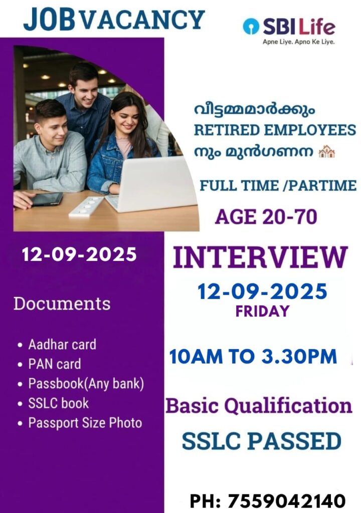 പൊതുമേഖലാ ബാങ്കിന്റെ അനുബന്ധ സ്ഥാപനമായ SBI Life വൈക്കം branch ൽ കമ്മീഷൻ /സാലറി അടിസ്ഥാനത്തിൽ ഫീൽഡ് advisors/ ഉദ്യോഗാർഥികളായ ആളുകളെ നിയമിക്കുന്നു.